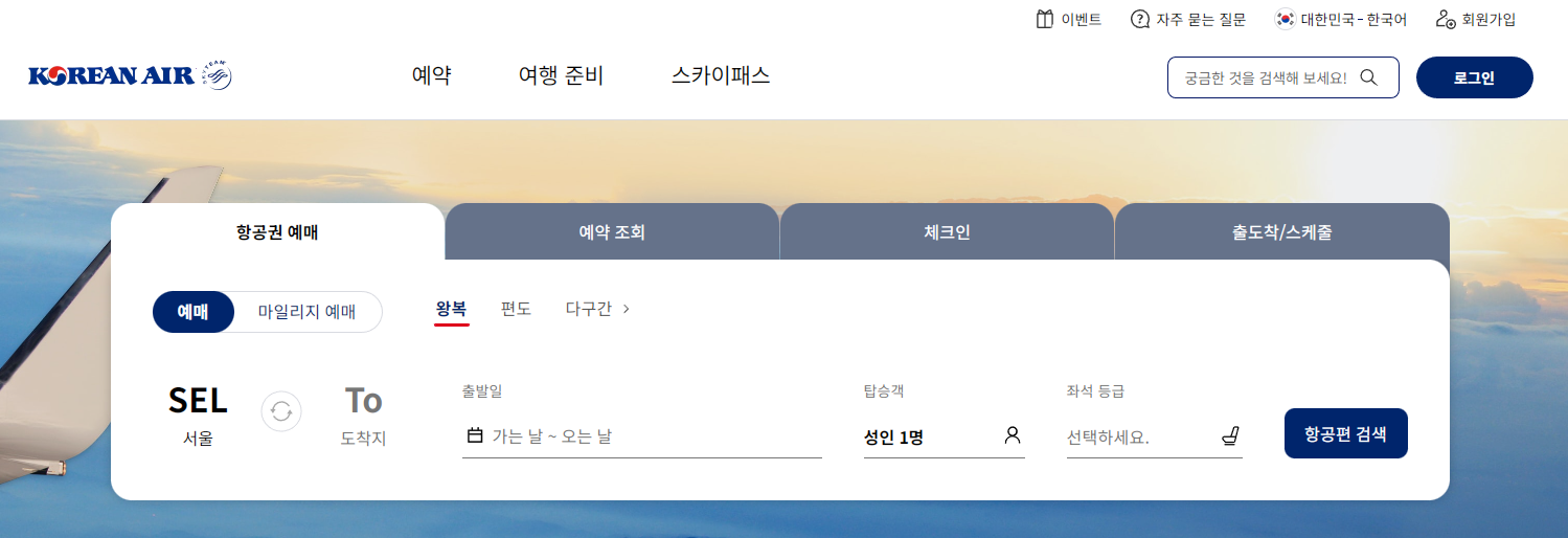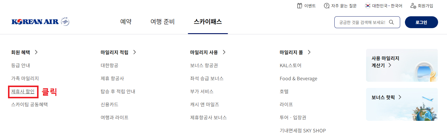 우선 대한항공 홈페이지로 접속합니다. 회원가입을 안하신 분들은 홈페이지에 접속하셔서 회원가입부터 진행해주세요. 링크를 통해서 들어가면 바로 제휴멤버쉽으로 들어갈 수 있습니다. 홈페이지를 통해서 접속하셨다면 스카이패스를 눌러줍니다.